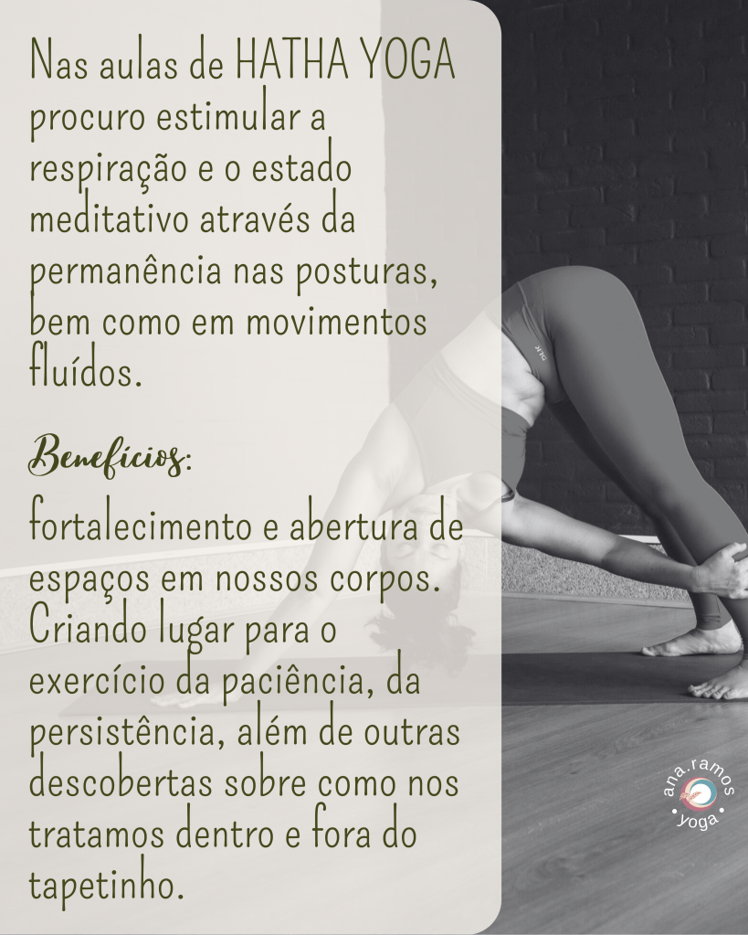 Uma prática da paciência e da permanência. A aula é um momento de pausa para quem está em busca de si, sendo a prática de yoga uma experiência promotora de diversos benefícios aos praticantes. O conjunto das séries de posturas trabalhadas em aulas, visa à integração do corpo como um todo, que sente, pensa, faz, respira, se relaciona, transpira…