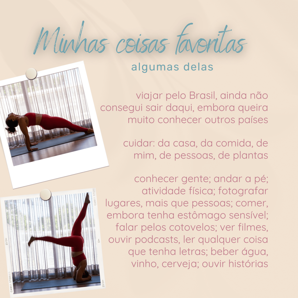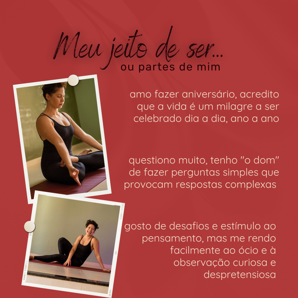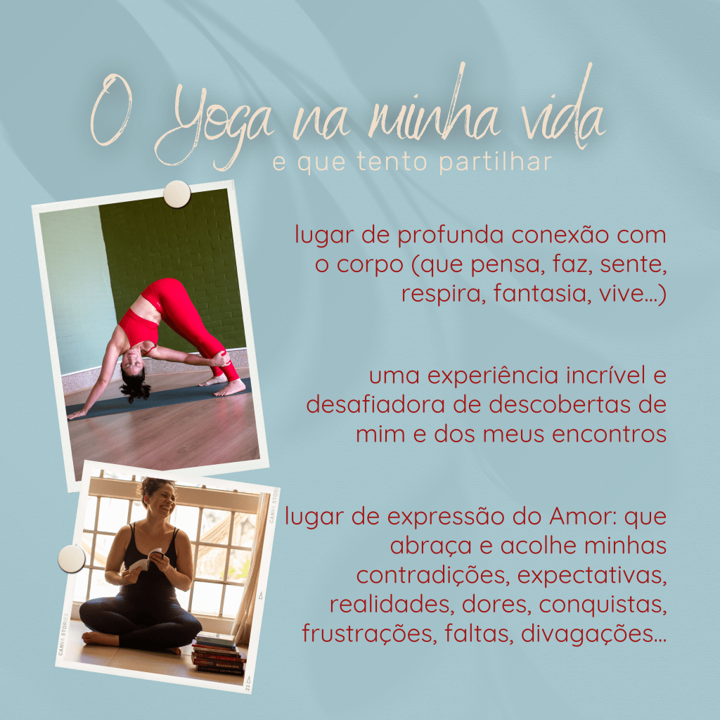 Tenho o Yoga como um espaço de expressão criativa, manifestação das imperfeições materiais e imateriais. Um lugar de transformações e de aprendizado multidisciplinar. Vejo na partilha do Yoga uma oportunidade de generosa troca e acolhimento. Assim, o que a princípio foi uma forma de acolhimento à minha própria alma, se tornou também um ofício.